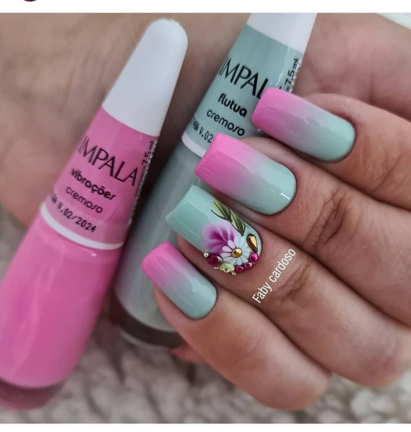 - Faça um degradé suave, começando com rosa na base da unha e gradualmente misturando com azul na ponta