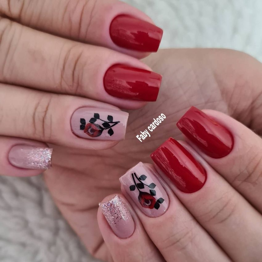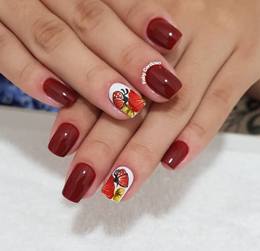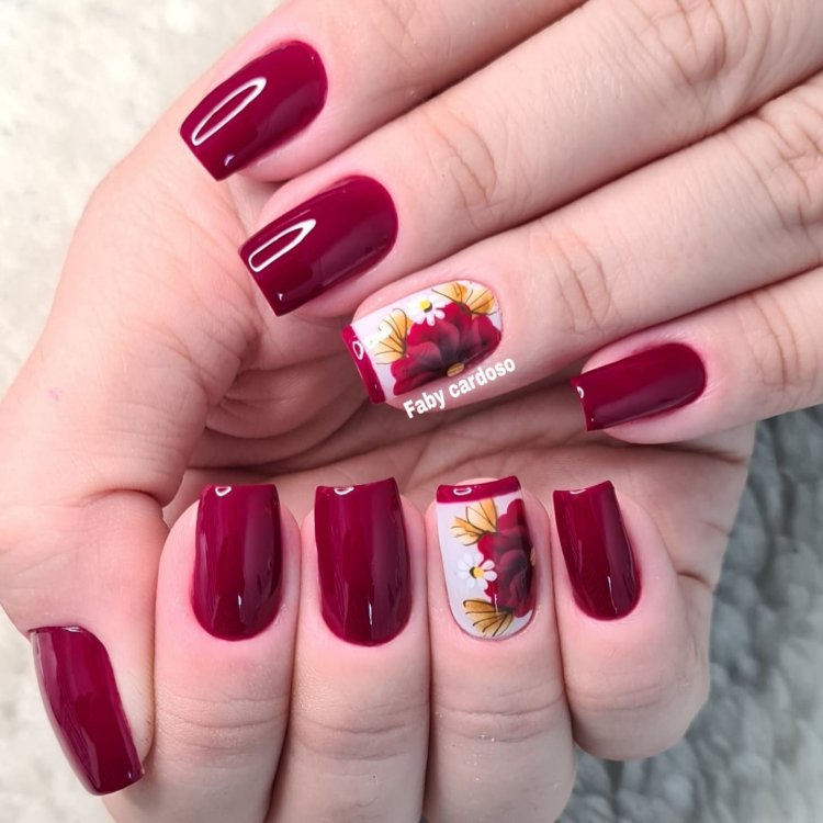 Antes de transformar suas unhas, é importante pesquisar qual decoração combina mais com o seu estilo, então, aproveite! Para quem adora um desenho mais delicado, flores sempre são bem-vindas! O tom mais escuro de vermelho compõe a paleta de cores perfeitamente.