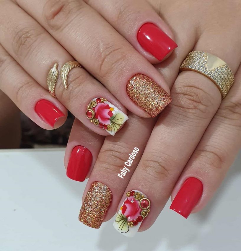 Unhas decoradas em tons dourados também nunca saem de moda, a paleta de cores vermelha, dourado e demais cores claras casam muito bem e podem ser uma ótima opção para os dias de festas a noite!