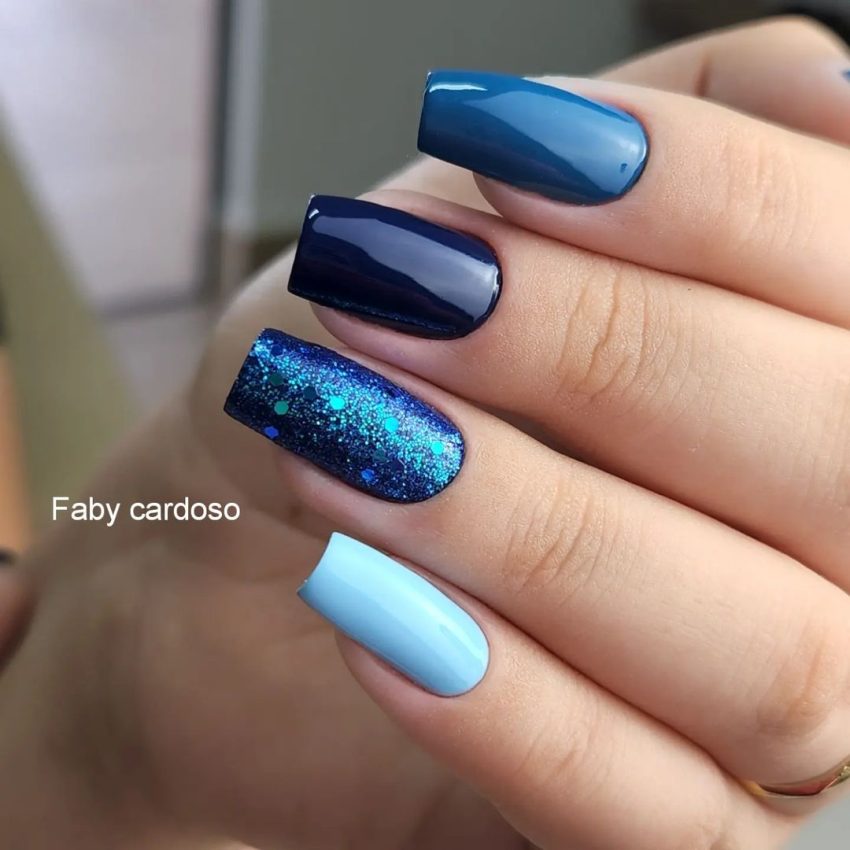 Tons mais próximos ou cores completamente opostas funcionam muito bem para diferenciar algumas unhas. E não precisa parar por aí. Adicione um brilho ou padrão geométrico para um toque extra.