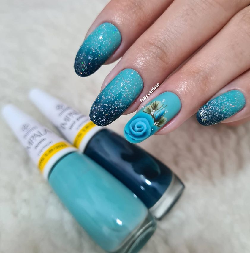 Primeiramente, uma das unhas mais pedidas com os tons de azul é a decoração em degradê. Nessa decoração, você pode usar vários tons de esmalte azul para dar o efeito que deseja. Pode acrescentar algum glitter nas unhas para dar um efeito final.