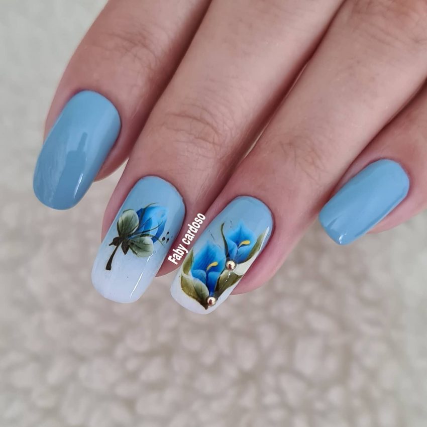 Você pode combinar o esmalte azul com a decoração de flores, o efeito fica lindo. Nesse sentido você pode usar o próprio esmalte azul para fazer as flores ou então usá-lo para fazer os detalhes.