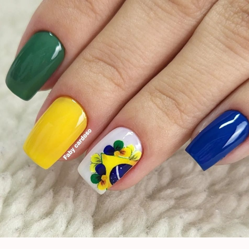 - Unhas com a bandeira do Brasil estilizada pode ser usada na Copa do Mundo com esmaltes azul e verde
