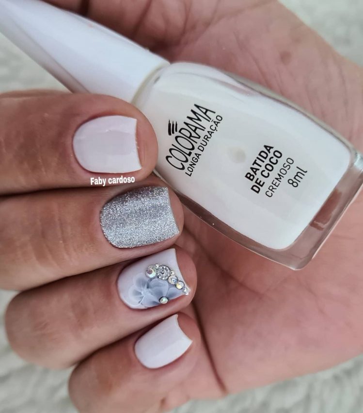 Outros esmaltes que combinam com unhas curtas são os esmaltes brilhosos. Você pode combiná-los com outras cores de esmaltes como o branco. Além disso, você pode usar uma cor de esmalte como fundo e passar um esmalte com brilho por cima. O efeito fica lindo e muito charmoso.