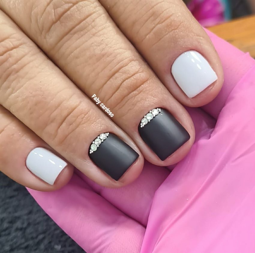 Unhas com um toque mais refinado e refinado para o dia a dia, ou até mesmo para um evento especial. Este design de unha é claro com variações brilhantes em outras unhas de pedra branca.