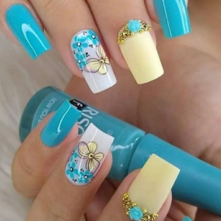 As unhas azuis claras são amadas pelas mulheres neste verão. Existem várias tonalidades e opções de combinação para eles. Pode ser misturado com outras cores como verde, laranja, rosa, tons terrosos e muito mais!