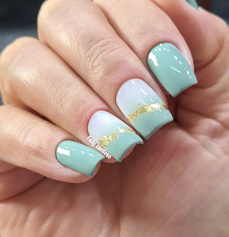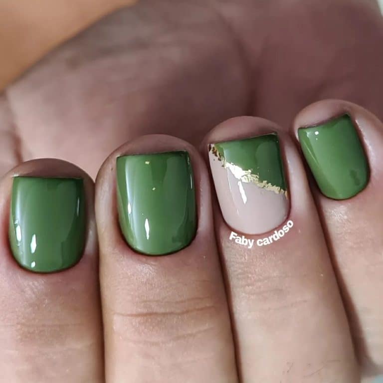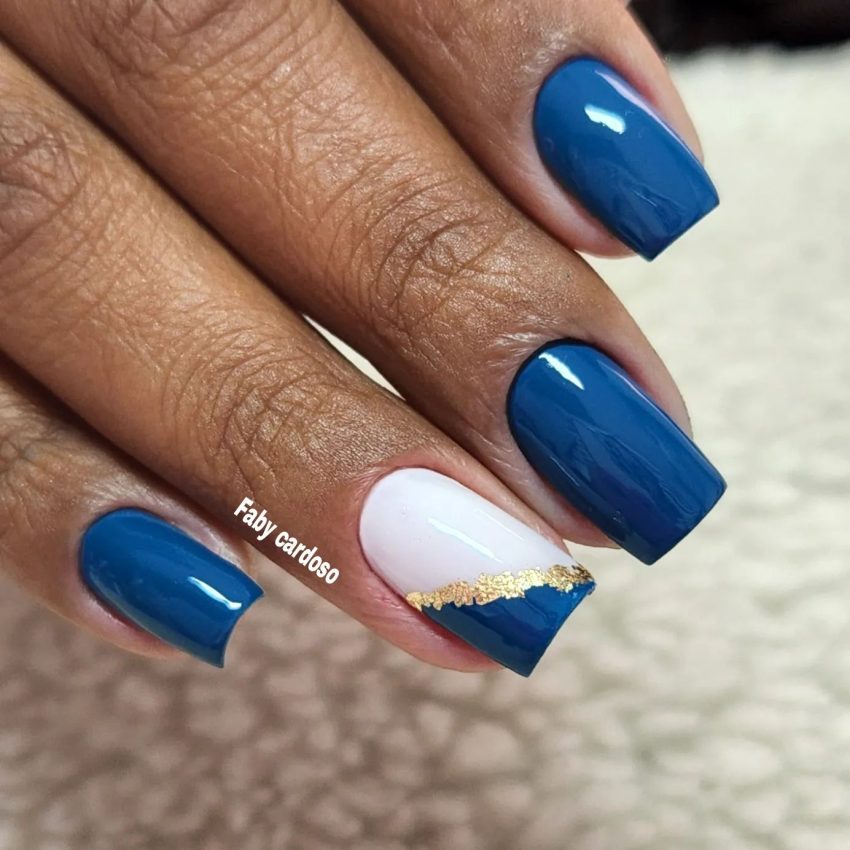 - Unhas pretas com folha de ouro- O esmalte preto é uma combinação repetitiva que contrasta fortemente com o ouro folheado a ouro. Pode aparecer em todas as unhas ou nos detalhes, dependendo do efeito que se deseja obter.